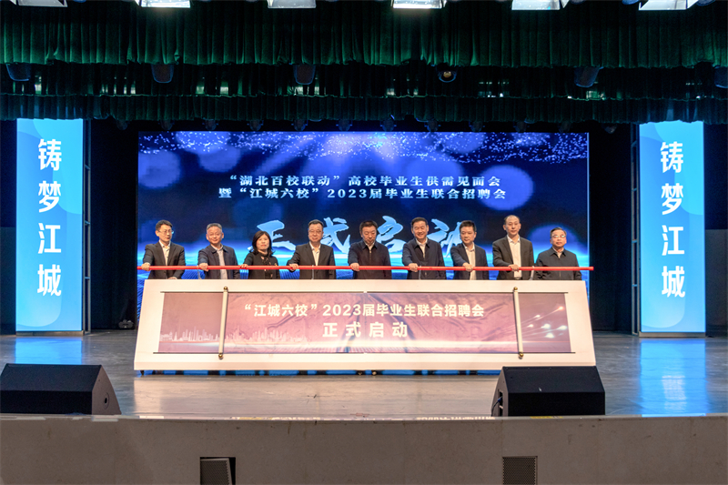 周启红、徐雁冰、尹云波与五校分管就业工作的校领导共同登台,一同启动“江城六校”2023 届毕业生联合招聘会活动。
