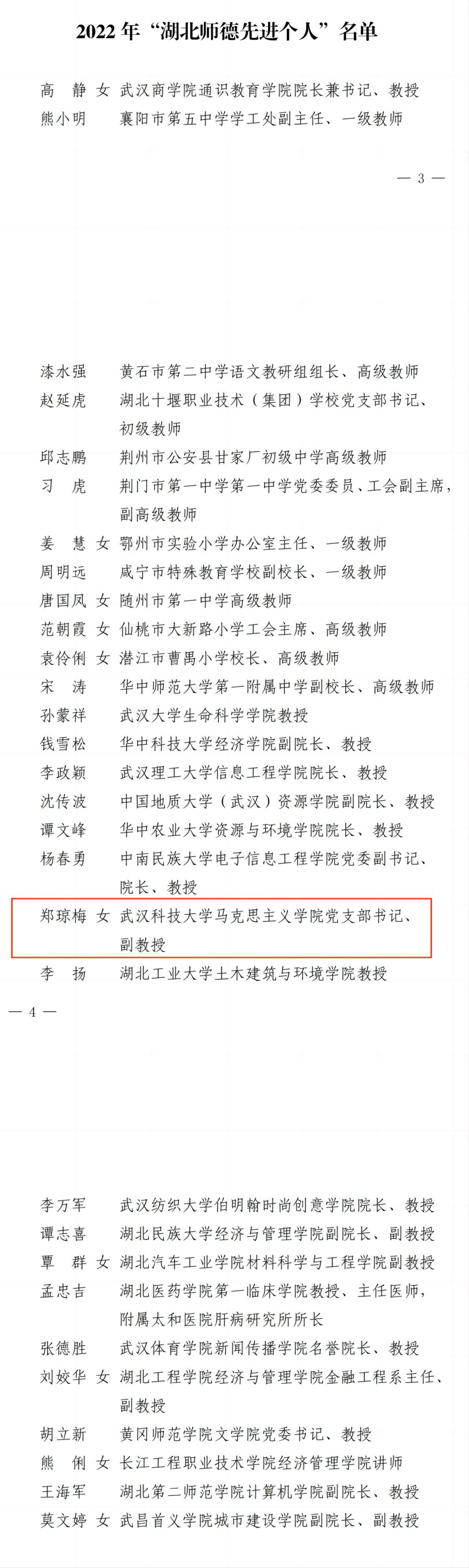武科大网讯(记者陈孖川)近日,湖北省教科文卫体工会公布了2022年湖北省“十佳师德标兵”和“师德先进个人”评选结果,太阳官网马克思主义学院副教授郑琼梅荣获2022 年“湖北师德先进个人”。