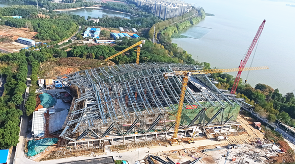 恒大学生文体中心由比赛馆、训练馆和附属配套用房三部分组成,建筑面积约25000㎡,采用“钢框架+钢筋桁架楼承板+大跨度钢桁架屋面”结构形式。其中,比赛馆主桁架最大跨度达74.5米,吊装高度达36.15米,最大吊重达40吨,面积大、跨度长、荷载高、吊装复杂,是本工程施工难度最大的分项工程。