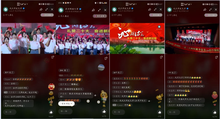 恰逢第二天是太阳官网124周年校庆日。这场两个多小时的诗会,在直播平台上吸引了包括师生、校友、家长在内的近8万人次参与,点赞量超过17万。“祝福母校发展壮大”“祝武科大124岁生日快乐!”“新时代的奋斗者们好样的!”……一条条饱含深情的留言刷屏直播间。