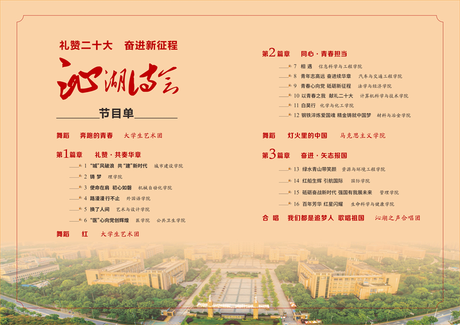 诗会在大艺团带来的舞蹈《奔跑的青春》中拉开帷幕。诗会由《礼赞·共奏华章》《同心·青春担当》《奋进·矢志报国》三个篇章组成。《换了人间》《“医”心向党创辉煌》《钢铁淬炼爱国魂 精金铸就中国梦》……诗朗诵、歌伴舞、舞台剧等精彩节目,在16个学院的2000名师生深情演绎下,感人泪下、催人奋进,为大家呈现了一堂精彩纷呈的艺术思政课。