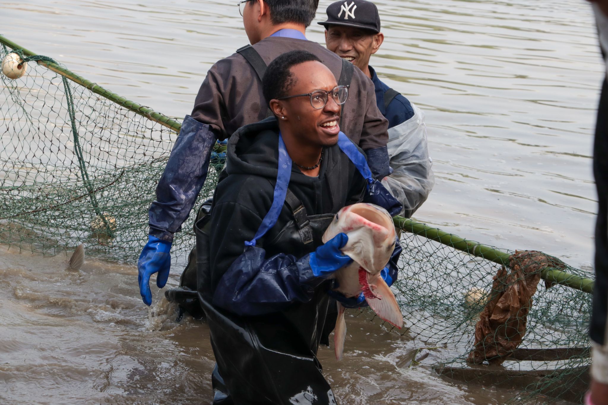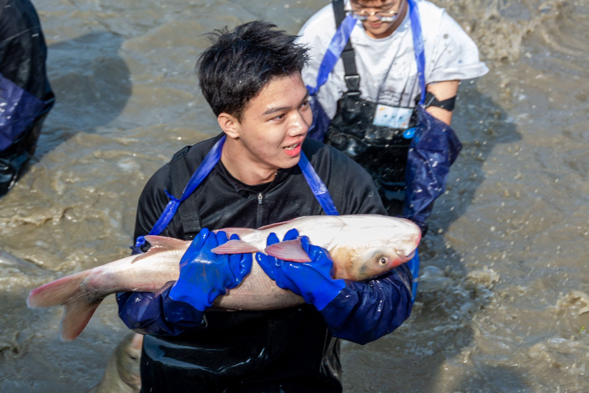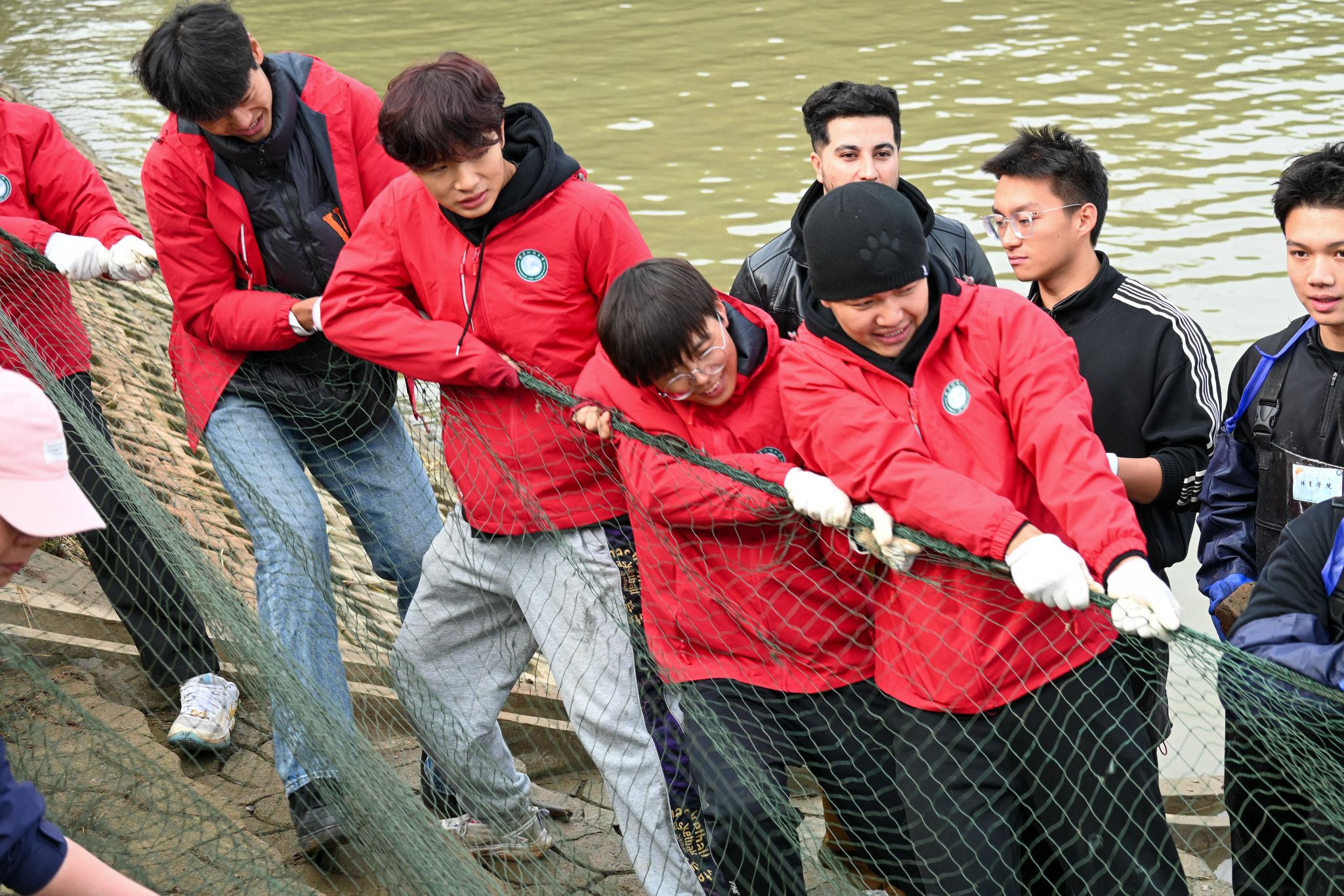 11月21日上午8时,学校近百名中外师生和后勤集团员工身着统一的红色服装,在沁湖边拉开了捕鱼活动的序幕。经过半个多小时的激烈争夺,信息学院徐润收获了一条20.5斤重的大鱼,获得了今年的“捕鱼王”称号。