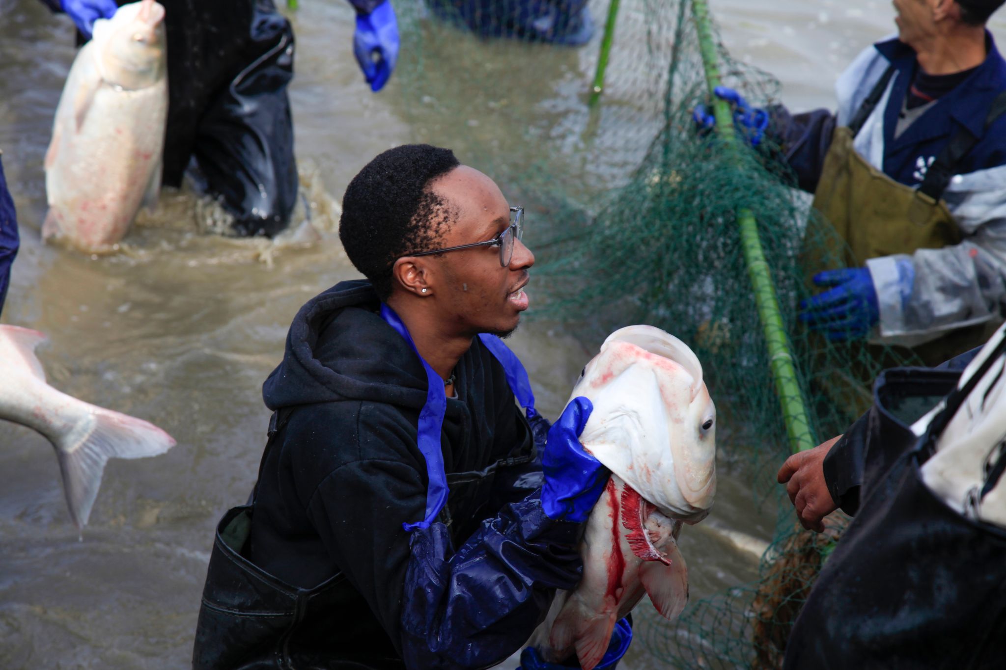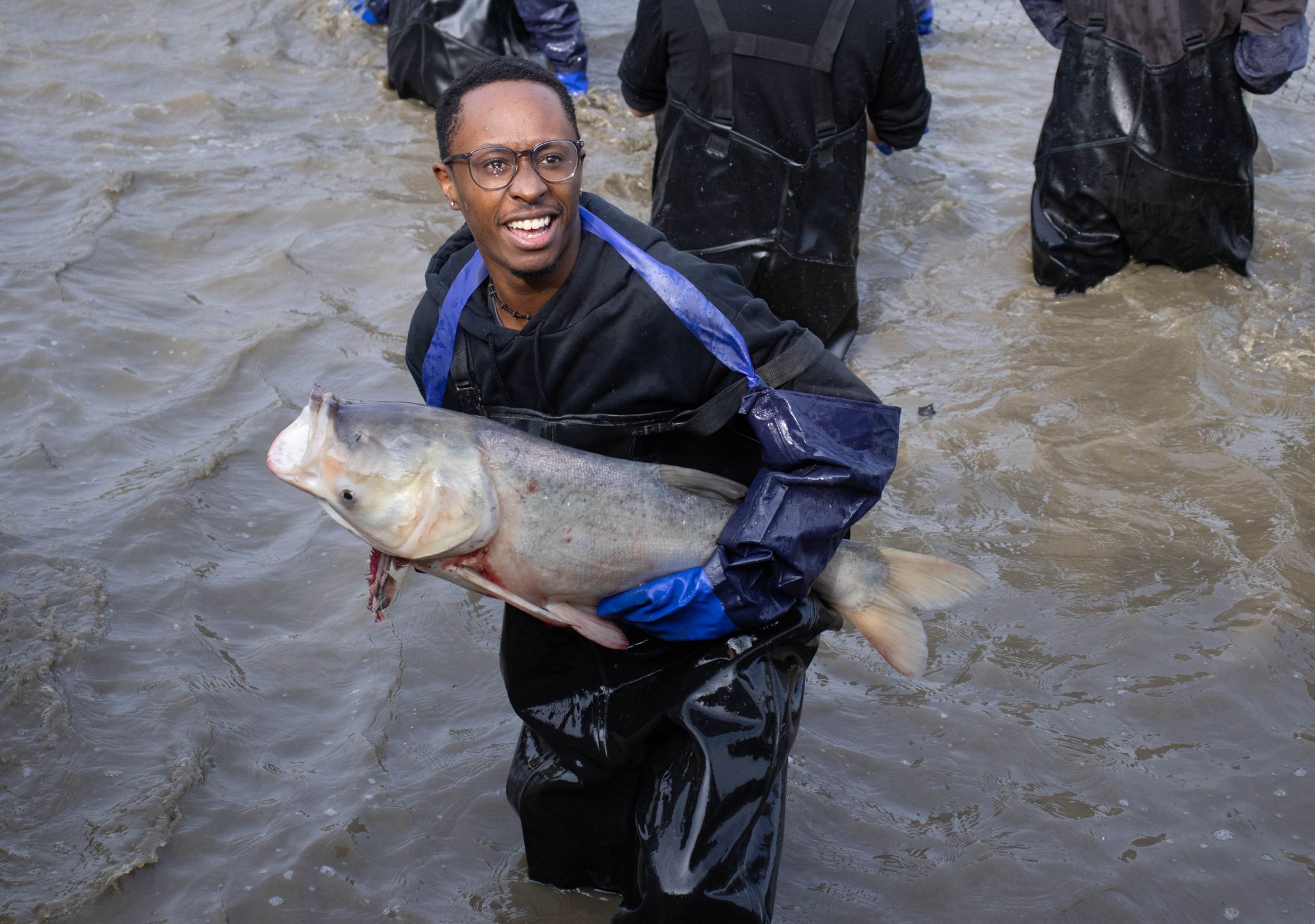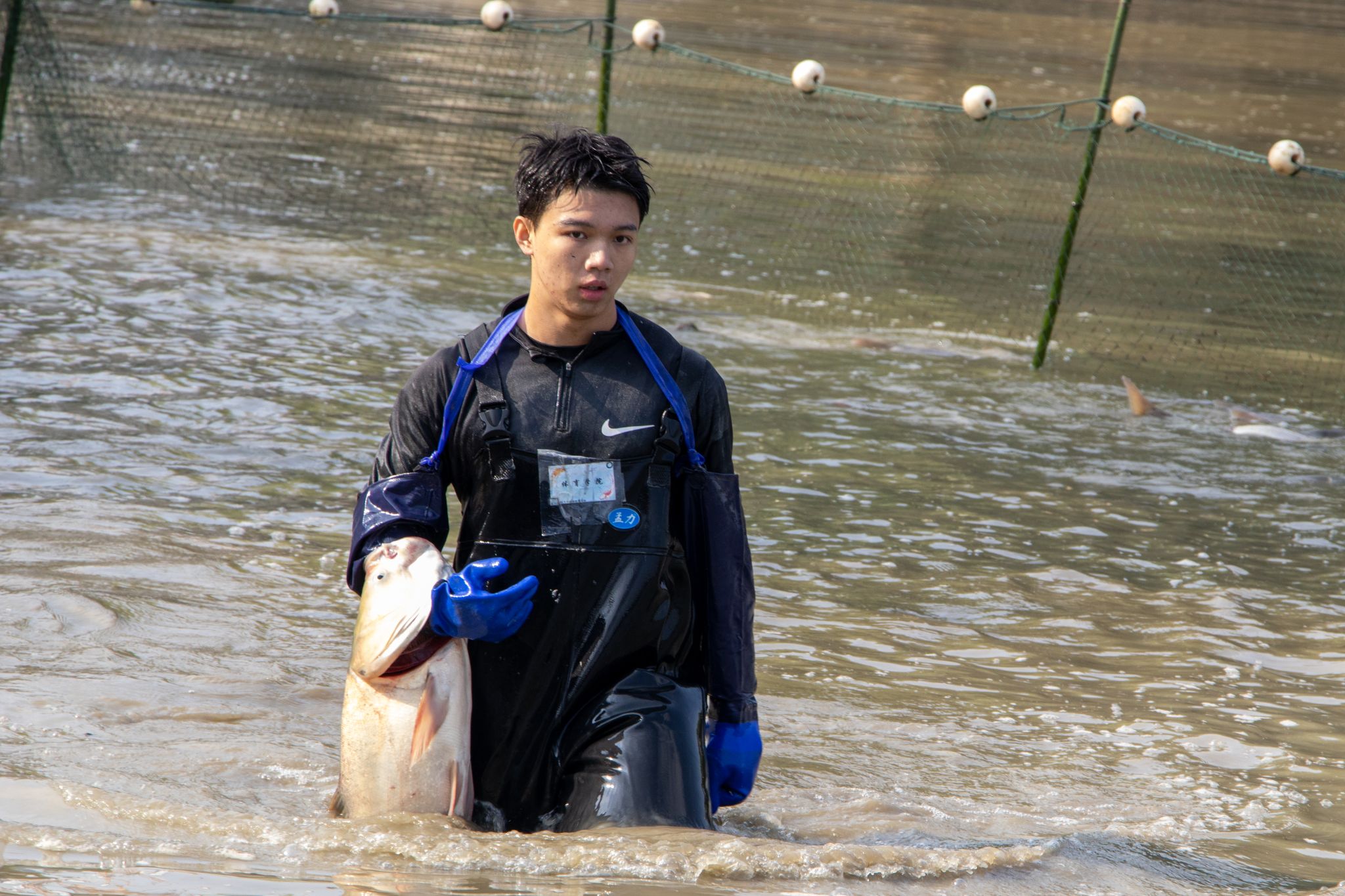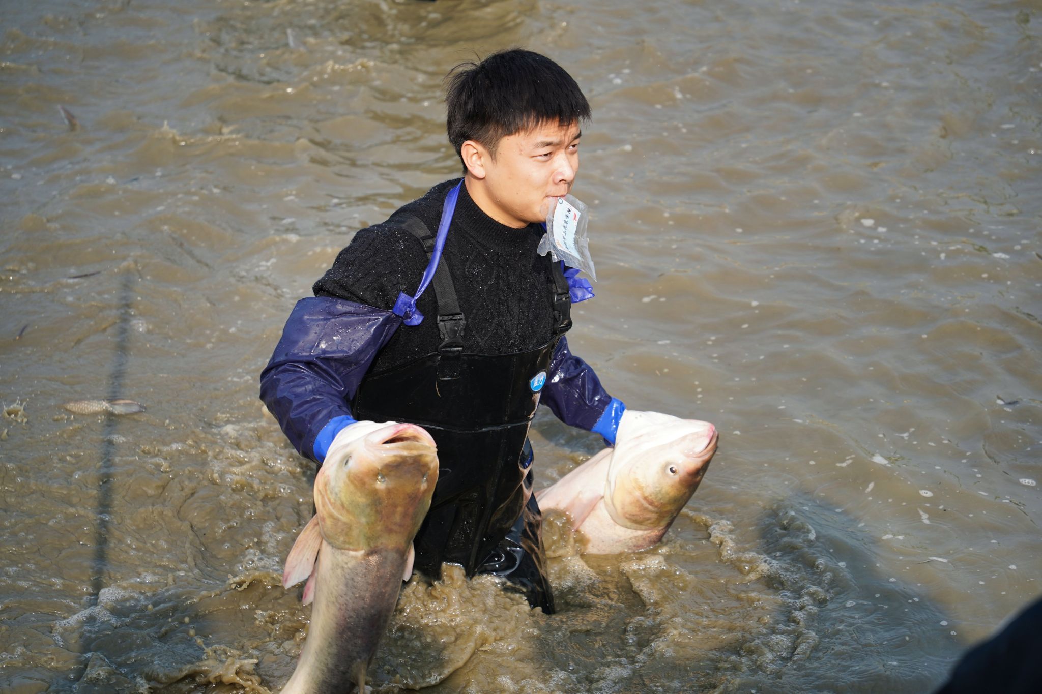 11月21日上午8时,学校近百名中外师生和后勤集团员工身着统一的红色服装,在沁湖边拉开了捕鱼活动的序幕。经过半个多小时的激烈争夺,信息学院徐润收获了一条20.5斤重的大鱼,获得了今年的“捕鱼王”称号。