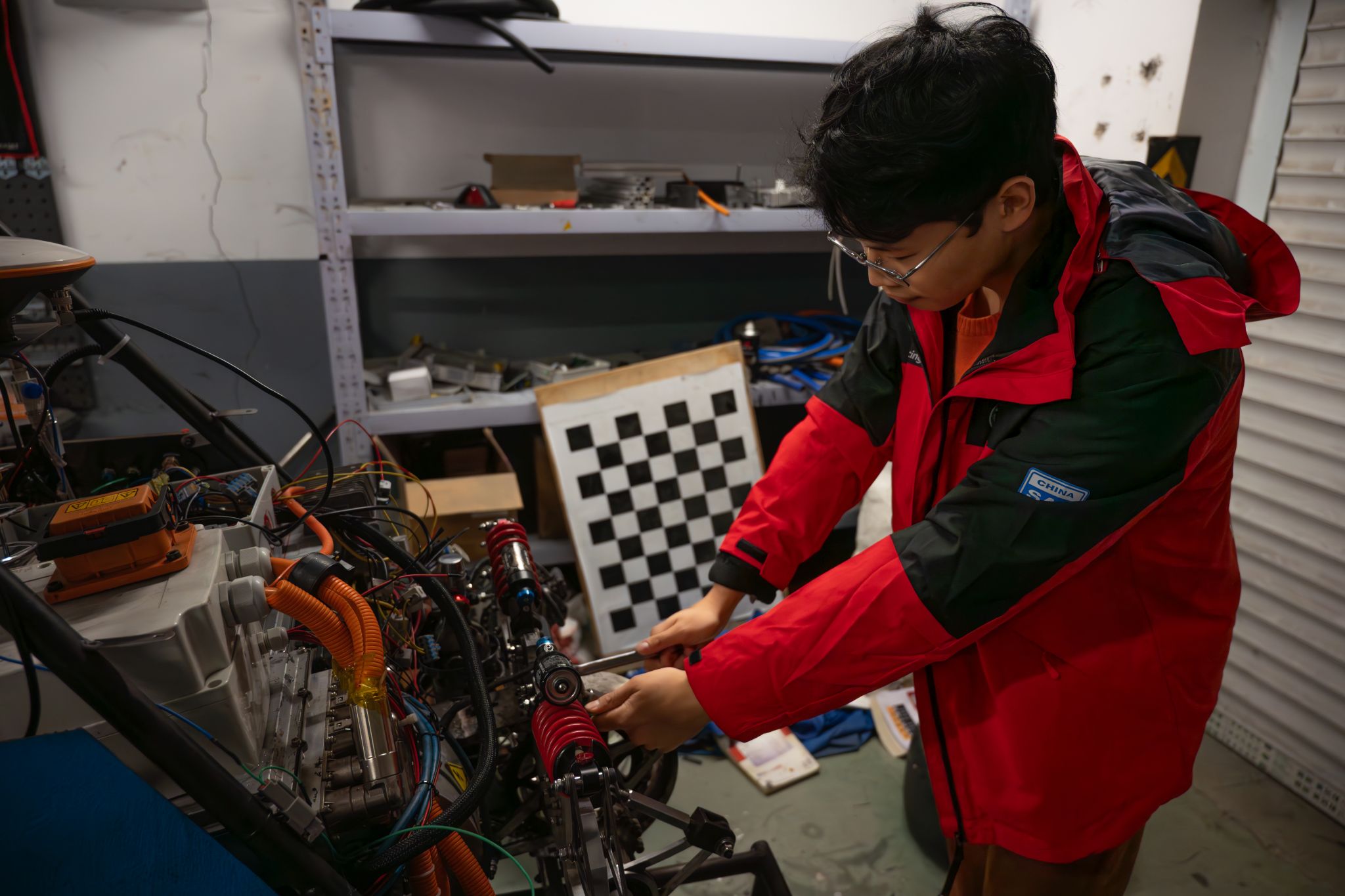 教十一楼连廊下,一间不起眼的屋子被塞得满满当当,橙黄色的灯光漫过墙面工具架——套筒扳手挂得整整齐齐,连角落的多层架上都叠着贴满标签的零件箱……这里是赤骥车队,也是汽车与交通工程学院2022级本科生汪刘鑫坚守了三年的“战场”。凭借这份热爱与坚守,这位绩点排名并不突出的“非典型”学霸,最终成功推免至国内车辆工程专业的顶尖学府——吉林大学。