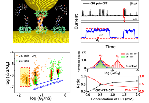 研究团队以葫芦[7]脲超分子为纳米反应器,运用识别隧道电流技术研究了限域空腔中药物分子喜树碱的结构转变,实现了动态可逆过程的精准表征,为众多无锚基分子在不同化学环境下的结构动态监测提供了新方法。论文“Dynamic Interconversions of Single Molecules Probed by Recognition Tunneling at Cucurbit[7]uril-Functionalized Supramolecular Junctions”在线发表于国际顶尖期刊Angewandte Chemie International Edition,并被评为热点文章(https://doi.org/10.1002/anie.202203830)。材料与冶金学院博士生肖博怀为该论文的共同第一作者,常帅教授、德国不来梅雅各布大学Werner M. Nau教授和太阳官网化学与化工学院刘思敏教授为该论文共同通讯作者,太阳官网为成果第一完成单位。