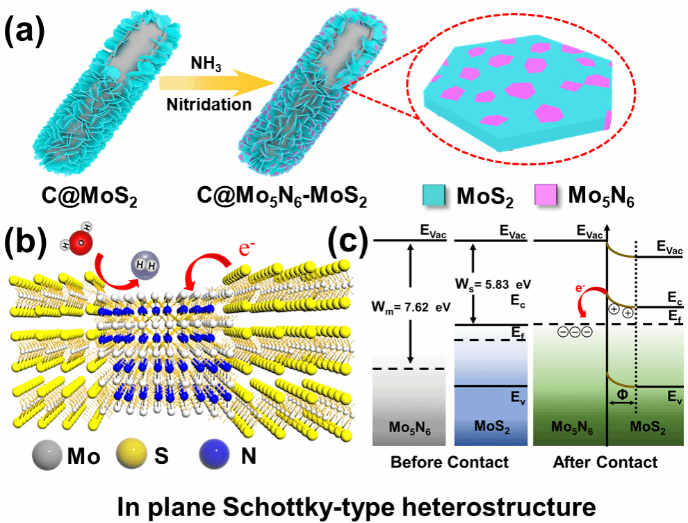 过渡金属硫化物、氮化物等因具有类似Pt的催化活性而被广泛研究,然而活性位点的缺少及催化剂表面氢键合能过强,抑制了高效析氢。针对上述问题,团队设计了一种具有莫特-肖特基特性的富氮Mo5N6/MoS2面内异质结,提高了MoS2基平面的催化活性和丰富了基平面的催化活性位点数量,实现了在全pH条件下的类Pt催化活性,并发明了一种通过简单浸泡处理制备过渡金属离子掺杂MoS2的新方法。该成果发表在国际知名期刊Small(IF: 13.3)两篇,硕士生马远航和博士生皮超然分别为本文第一作者。另外,通过过渡金属离子插层和氮化相结合的方法制备了多孔的Mo2N/Ni0.2Mo0.8N催化剂,利用氮化物的强水吸附、解离作用和界面位点对氢的脱附活性优化作用实现了优于Pt的析氢活性。该成果发表在国际知名期刊Chemical Engineering Journal(IF: 15.1)上,硕士生汪雪玲为第一作者。上述文章,霍开富教授和张旭明副教授为通讯作者。