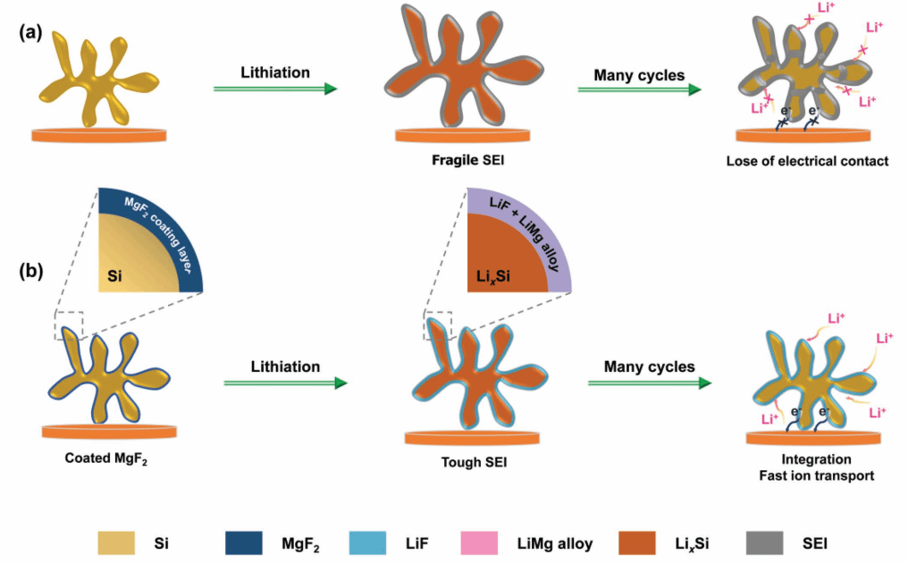 研究团队针对多孔硅作为锂离子电池负极材料仍面临的离子传导率低、界面不稳定的问题,设计了两种人工界面功能层SiN和MgF2,来增强多孔硅界面结构的稳定性,提升其电化学储锂性能。相关研究成果发表在中国卓越计划期刊Journal of Energy Chemistry(IF: 13.1)和Advanced Functional Materials(IF: 19.0)。两篇论文中,博士生梅士雄为第一作者,霍开富教授和高标教授为通讯作者。