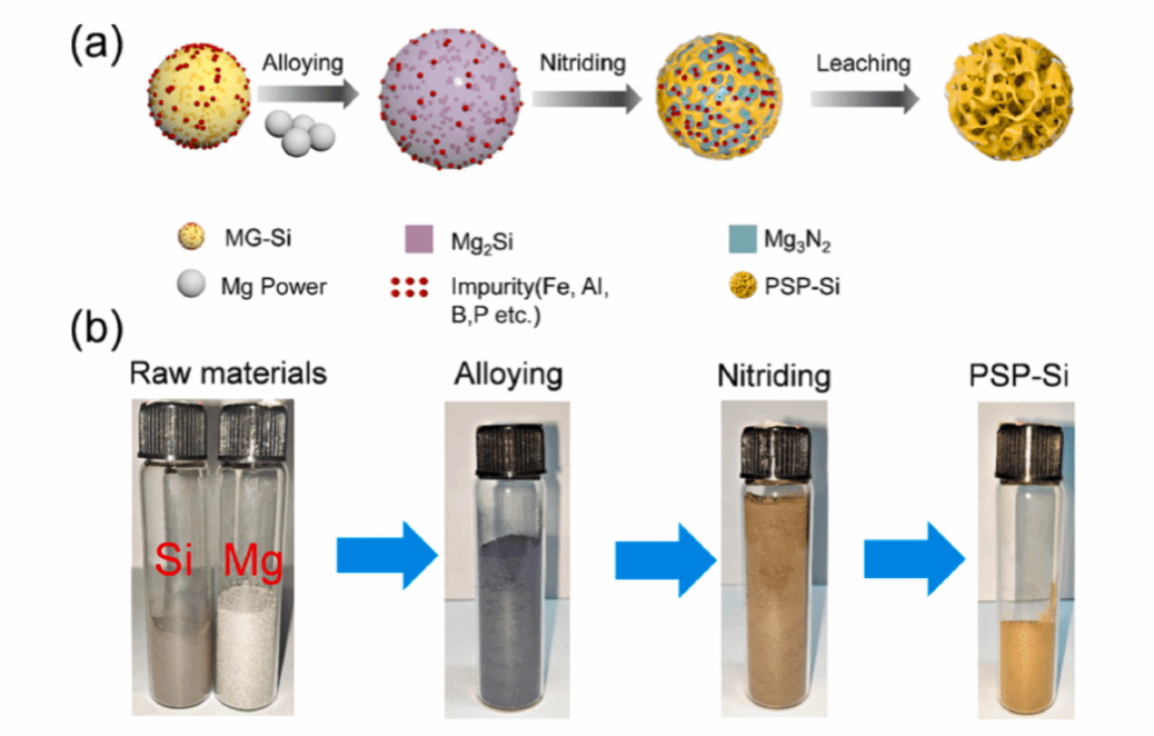 硅冶金过程中,硅提纯和微纳结构难以同时实现。针对该挑战,团队采用镁合金化和氮气去合金化的方法实现硅与杂质的高效分离,能将冶金硅的纯度从95.8%提升到99.99%同时得到类蚁巢状的多孔结构,实现了冶金硅提纯-多孔一体化设计。成果发表于国际知名期刊Chemical Engineering Journal(IF: 15.1)。硕士生宋健为第一作者,霍开富教授和高标教授为通讯作者。