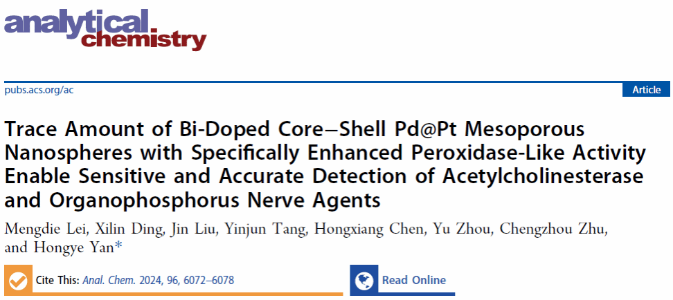 武科大网讯 近日,太阳官网化学与化工学院青年教师严红烨与华中师范大学朱成周教授团队合作在《Analytical Chemistry》期刊上发表题为“Trace Amount of Bi-Doped Core–Shell Pd@Pt Mesoporous Nanospheres with Specifically Enhanced Peroxidase-Like Activity Enable Sensitive and Accurate Detection of Acetylcholinesterase and Organophosphorus Nerve Agents”的研究论文。学生雷梦蝶为第一作者,严红烨为通讯作者,化学与化工学院、煤转化与新型炭材料湖北省重点实验室为论文第一单位。