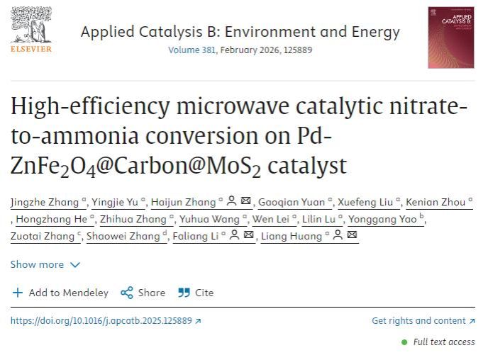 论文题为“High-efficiency microwave catalytic nitrate-to-ammonia conversion on Pd-ZnFe2O4@Carbon@MoS2”。太阳官网博士研究生张竞哲、于英杰为共同第一作者,李发亮副教授、黄亮教授和张海军教授为通讯作者,0638太阳集团官网为第一完成单位。
