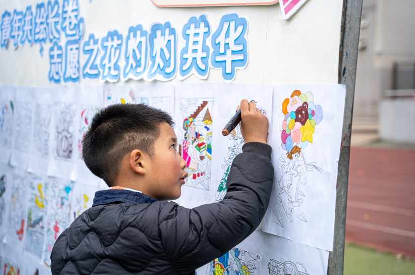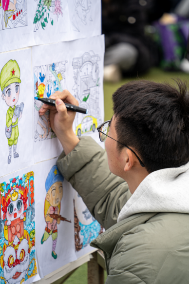 在画布墙前,该校青年志愿服务总队的队员们引导在活动现场游玩的小朋友们一同作画。总队外联部部长罗光煊说:“我们摆出了许多关于雷锋形象、和平鸽、党徽等的图画供小朋友们填色,并且给他们分享志愿活动的乐趣,希望能在他们心中播下志愿的种子。”