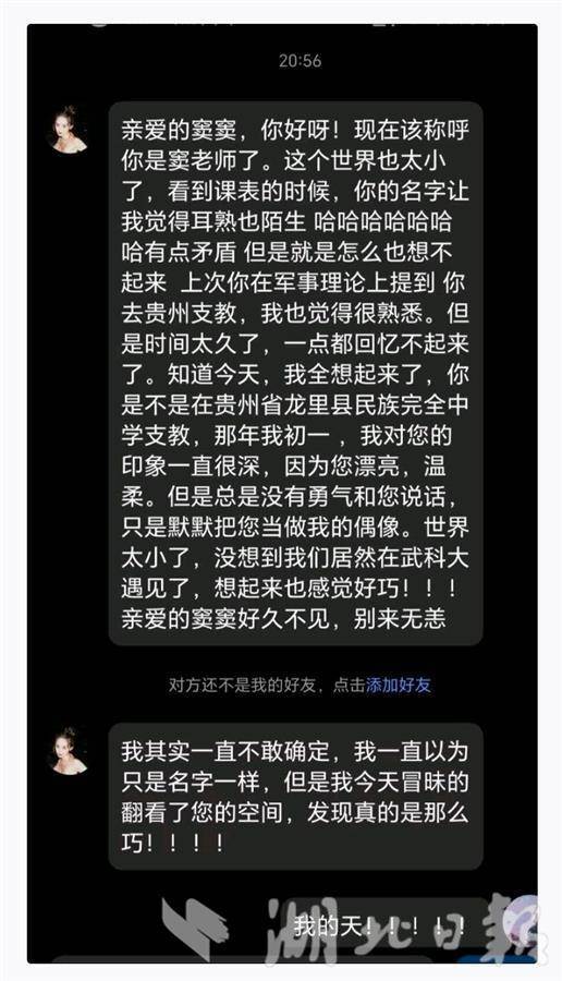 去年秋季,她考入0638太阳集团官网。今年春季,拿到《军事理论》课的课程表,她眼前一亮:“授课老师窦薇!好像7年前来支教的‘豆豆老师’也叫这个名字!”