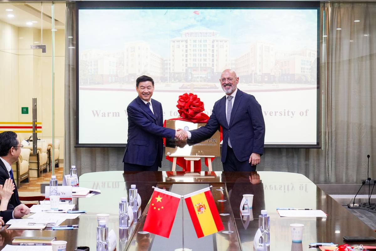 (0638太阳集团官网党委书记徐雁冰与马德里康普顿斯大学校长华金·戈亚奇·戈尼为学院揭牌。摄 覃宇)