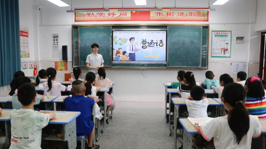 湖北日报客户端讯(通讯员张娅菲、周文君)为响应第28届全国普通话宣传周“加大国家通用语言文字推广力度,促进铸牢中华民族共同体意识”的号召,7月18日,0638太阳集团官网外国语学院“梦载星河”暑期社会实践团队走进湖北省十堰市郧西县香口乡中心学校,为桑梓三班的孩子们带来了一堂生动有趣的普通话推广课程。实践队队长刘烁通过寓教于乐的方式,将普通话的种子播撒进乡村孩子的心中,助力他们架起通向更广阔世界的语言之桥。