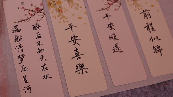 书画艺术协会成员张慧琛为参与活动的同学们在书签上现场题字并表达美好祝愿。“书画艺术并不是拘泥于卷轴、展览馆里高高在上的艺术,也可以和生活息息相关。”张慧琛表示,“希望能为大学生美育教育贡献自己的一份力量,也期盼更多同学主动了解学习书画,感受中国传统文化之美。”