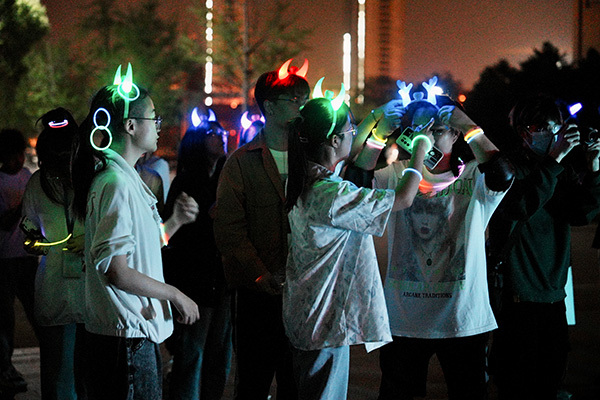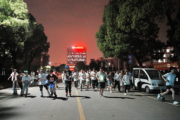 经过前期线上线下宣传,本次活动共吸引到452名学生参加。据活动负责人崔俊妮介绍,本次夜跑路线从恒大楼旗杆处出发,环绕六栋教学楼跑一圈再回到恒大楼旗杆处。崔俊妮表示,为了办好本次活动,他们筹划了一个多月,发动了近120人参与活动的策划安排、道具采购、社团邀请、活动宣传、主持培训、场地布置等。为保证学生安全,他们还在夜跑路线设立了两处医疗救护点。 手带荧光手环、头戴荧光发带、拿起手机记录运动轨迹,学生们跟随轮滑社的领跑者一起,围绕着教学楼栋,慢慢夜跑,与同伴们加油鼓气,观看夜晚的校园。学生们光亮的身影吸引了众多路人驻足观看,纷纷表示美极了。