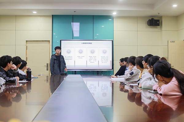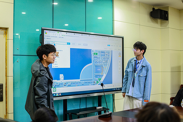 互动环节,袁钊抛出问题:“如果我想考研,在图书馆安静学习,怎么利用虚拟图书馆找到我的目的地呢?”材料2212班彭宇豪上台展示,动手实操并介绍道:“选择黄家湖校区图书馆,选择二楼,进入自主学习区域。在这里,你可以安静地背单词、写论文、备战考研。”