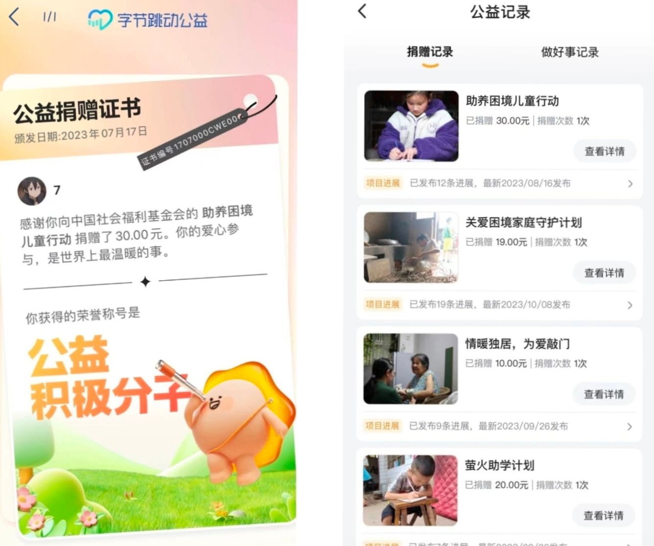 据了解,“每月的公益捐款”是指他平时在刷短视频时会碰到“中国志愿服务基金会”发布的困难儿童家庭的求助视频,随后便会毫不犹豫地为其捐款20—40元的金额,平均下来每个月都会捐赠2—4次。他还展示了每次捐款后获得的证书,目前累计已有10余张。“制订自己的消费计划,一方面在物质条件上能够奖励自己,另一方面能帮助真正困难的人,在精神上也能够满足自己的。”赖震修说道。