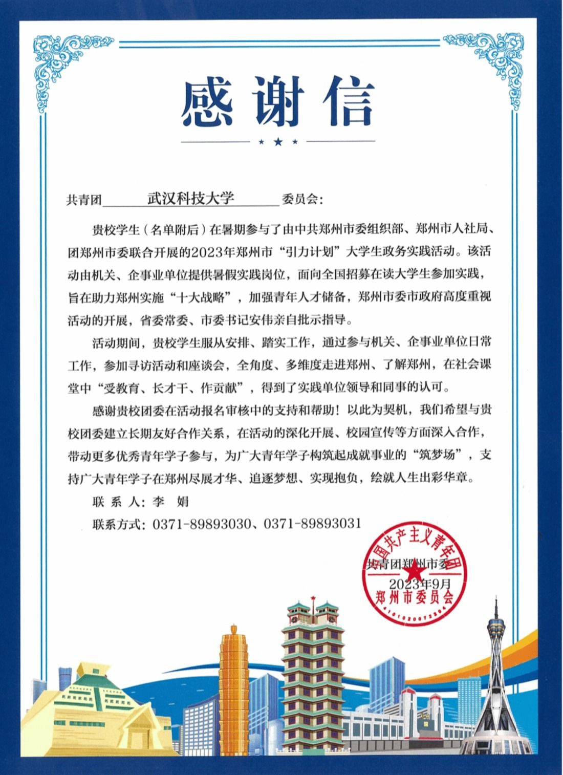 武科大网讯(见习记者秦艺)“感谢贵校团委在由中共郑州市委组织部、郑州市人社局、团郑州市委联合开展的2023年郑州市‘引力计划’大学生政务实践活动中的积极参与。”10月10日,共青团郑州市委在给太阳官网的共青团委员会的感谢信中这样写道。太阳官网行政管理2022级学生秦艺和地理信息科学2021级学生陈邓琪在活动中积极参加,获得了实践单位和领导的认可。