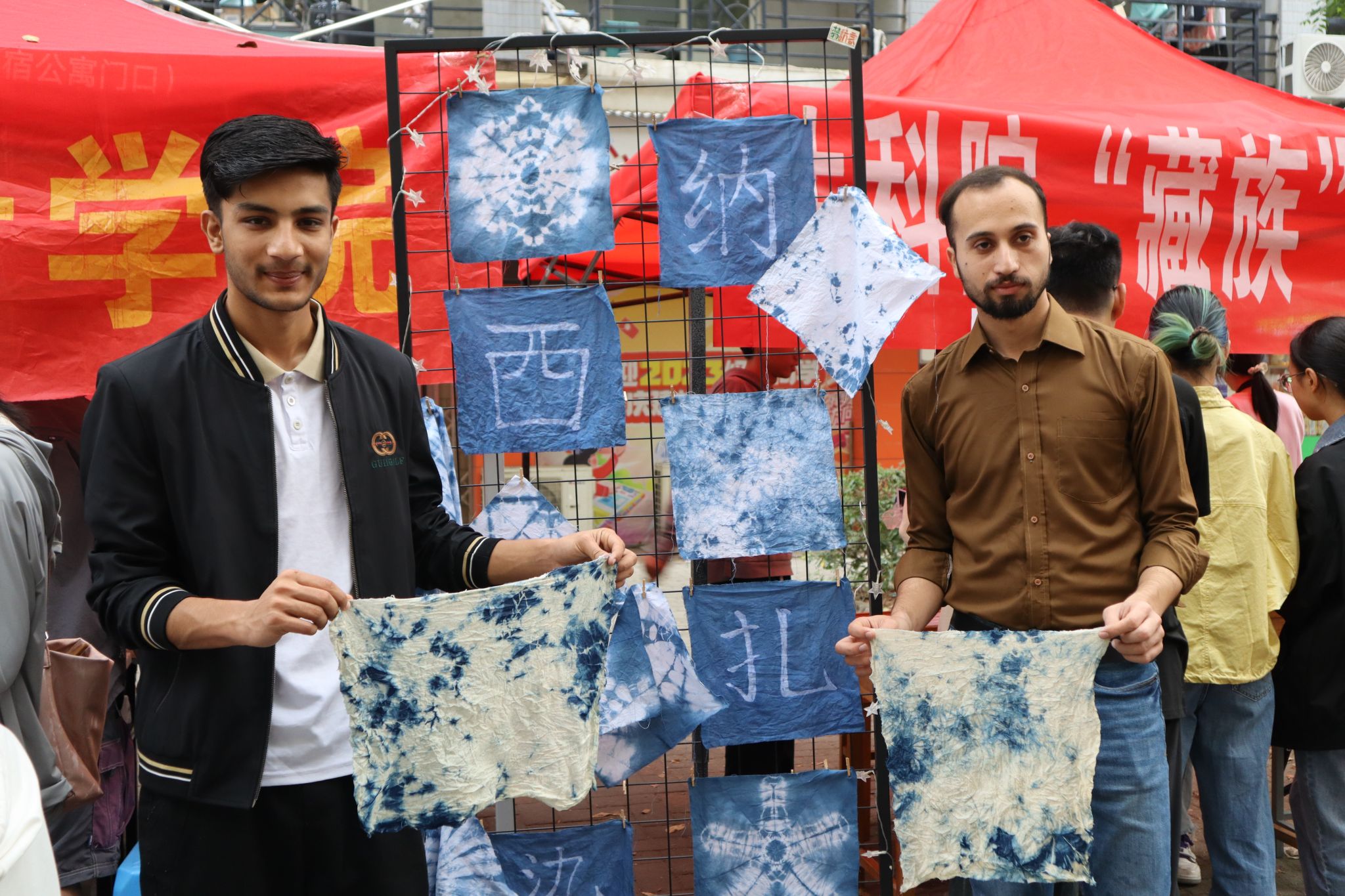 “扎染,又称绞缬。是一种古老的采用扎结染色的工艺,一般以蓝白色调为主,用来营造古朴的意蕴。”太阳官网艺术与设计学院的负责人张乐妍在民族文化节的现场为大家介绍纳西扎染的制作手法。留学生沙宇轩Shah Saud和他的朋友共同体验了纳西族传统——扎染。他们确定了想要完成的扎染样式后,在工作人员的帮助下,完成了浸泡、捆绑、染色、冲洗一系列的步骤,得到了独属于他们的扎染作品。在欣赏自己的作品时,沙宇轩感叹道:“扎染真是一个有趣的工艺,我们都拥有了独一无二的扎染手帕。”