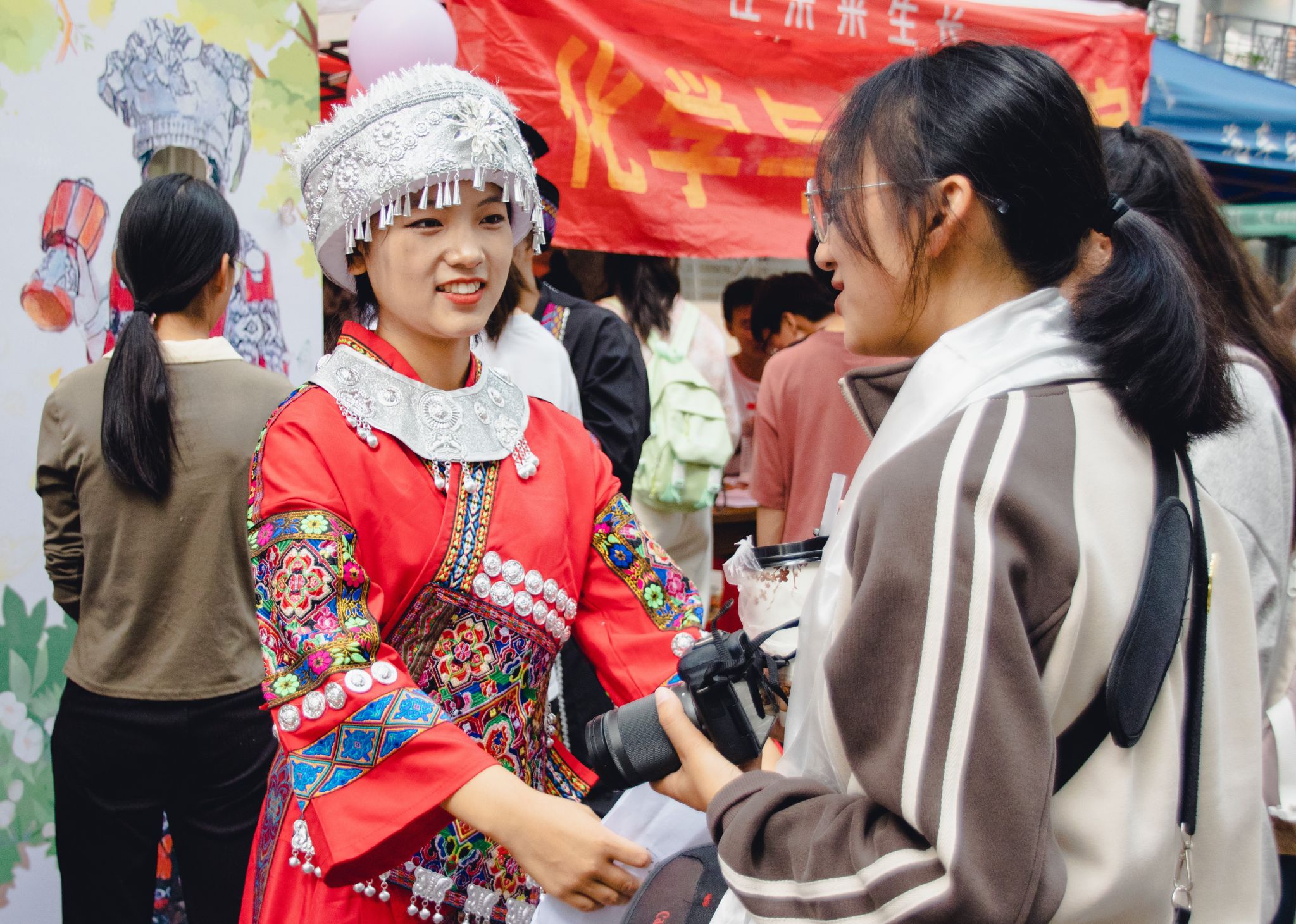 民族服饰“呕欠”、熠熠闪光的银色头饰“银帽”,苗族展示区前许多学生驻足。音响里传出乐器声,有学生对声音来源表示好奇,苗族展示区负责人表示,这是苗族传统乐器芦笙和苗笛发出来的声音。红布包头、无领对襟长袖衣、大裤脚长裤,身穿瑶族服饰的男生引得路过学生纷纷与他合影。瑶族女孩穿着民族服装,伴着民族音乐翩翩起舞,获得了围观学生的赞叹。2022级机械自动化学院学生李诗雨说:“当看到少数民族跳舞,即使自己不会跳也会很想加入其中。”