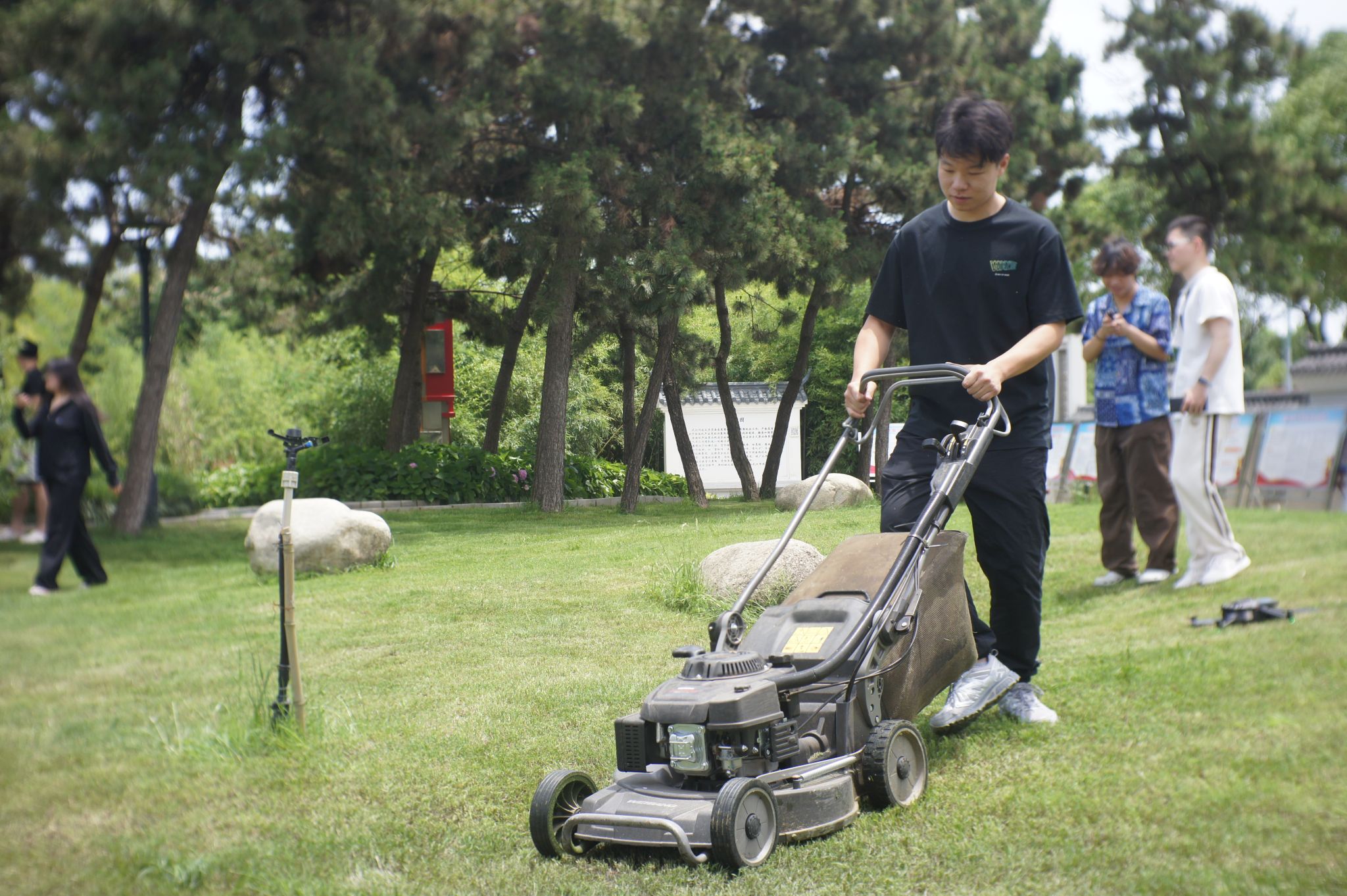 “拉动这里启动除草机,捏紧后把手,机器就往前走。”体育学院2023级学生张新元在后勤集团职工指导下,一把拉动油门线,伴随“嗡嗡”的轰鸣,开始控制除草机前行割草。一开始,除草机的路径歪歪扭扭,熟练后,他能够平稳地推动机器割完一整圈的草。“学生们的干劲很大!我们也不要落后!”太阳官网信息科学与工程学院2022级辅导员潘鑫一边操纵机器,一边笑着说。