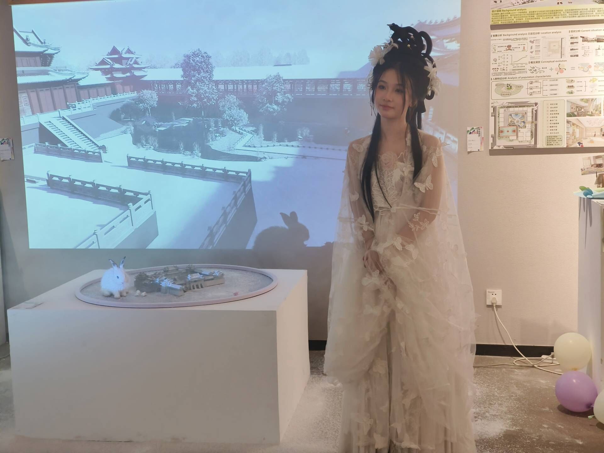 馆内,“嫦娥”抱着“玉兔”站在“仙气”缭绕的广寒宫前,正在与路过的学生互动。环境设计专业毕业生张哲晗以微缩模型及视频投影的形式呈现“广寒宫”。现场布置了烟雾喷气机,张梓译化身“嫦娥”,在广寒宫模型旁手捧“玉兔”与观众互动。该校大二学生王佳齐感慨:“好像真的看到了神话中的广寒宫!”