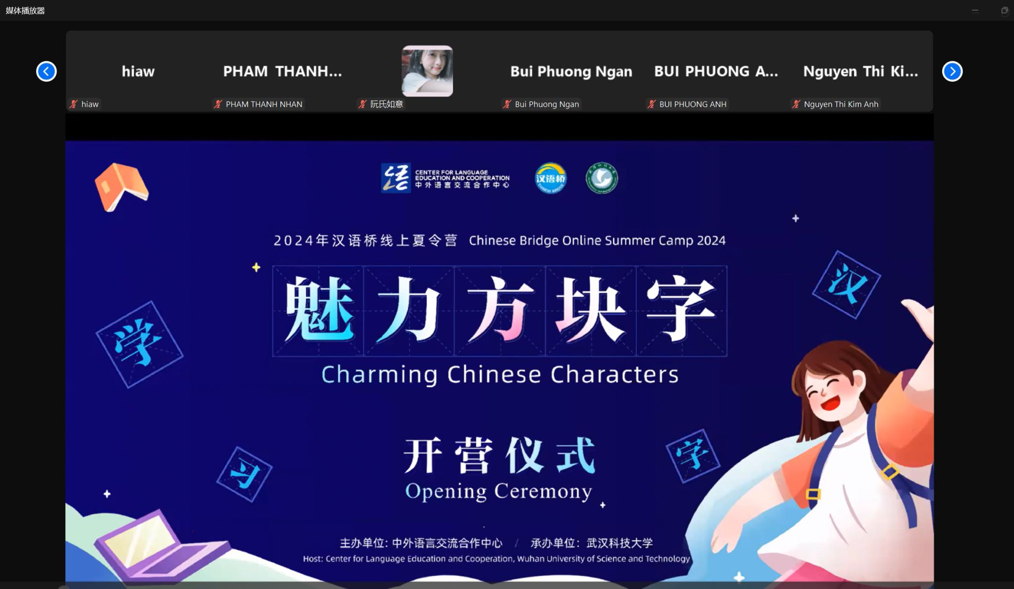 武科大网讯(通讯员周同江)8月26日,由教育部中外语言交流合作中心主办、太阳官网承办的“汉语桥·魅力方块字”线上夏令营于线上开幕。来自俄罗斯、泰国、巴基斯坦、塞尔维亚等数14个国家的398名国际中文学习者将在未来九天将齐聚“云端”,学习汉字,感受汉字的魅力。