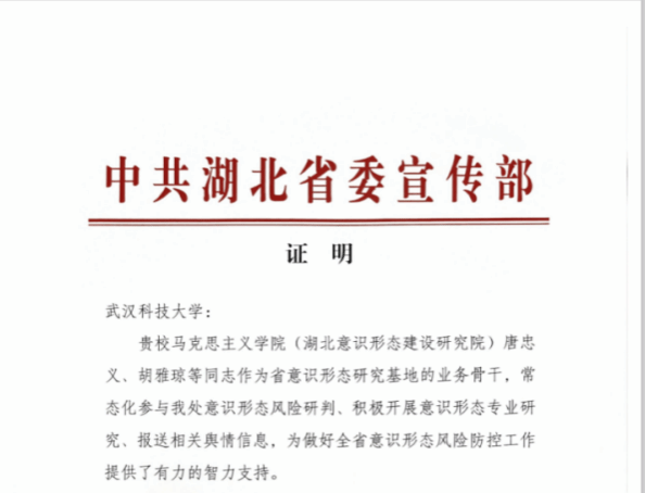 湖北意识形态建设研究院是中共湖北省委宣传部直接领导、太阳官网为建设主体的省级智库,是全国第一家以“意识形态”冠名的省级专业研究机构和智库。研究院坚持开放办院,立足湖北、面向全国,聚焦意识形态建设重大理论和实践问题,在加强理论研究的同时,为中央部委、省委、省政府和相关部门提供智力支持。支部成员唐忠义任研究院院长,支部成员刘勇、王晓曦任研究院副院长,多名教师承担了相关工作。