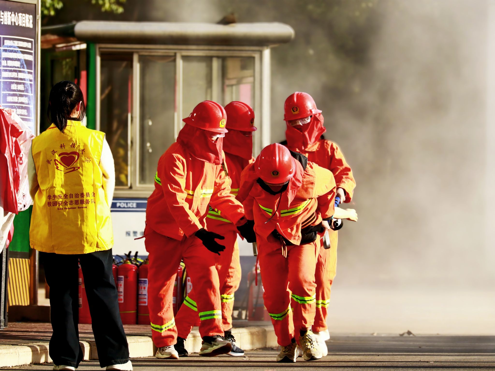比赛渐入佳境,学生表现也愈发熟练。一插一拧,动作干脆利落,消防水带迅速被接好;开启阀门,水流稳稳喷射而出,精准扑向目标。穿戴服装时,双手熟练地提拉、系紧腰带、调整肩带,转眼间,消防服已穿戴得整整齐齐。拿起灭火器,瞄准火源,粉末喷出,火灭而白烟起;打开担架,四人协作,抬起“伤员”往回跑。材料学部学生刘夏昱感慨道:“初赛、复赛理论考,决赛实操练,消防器材操作方法刻在脑子里了。亲手操作灭火器,实实在在练出应对火灾的动手和反应能力来了。”