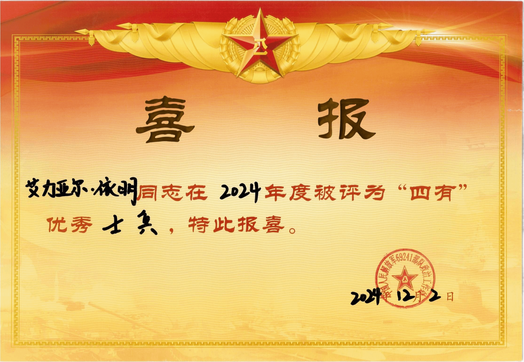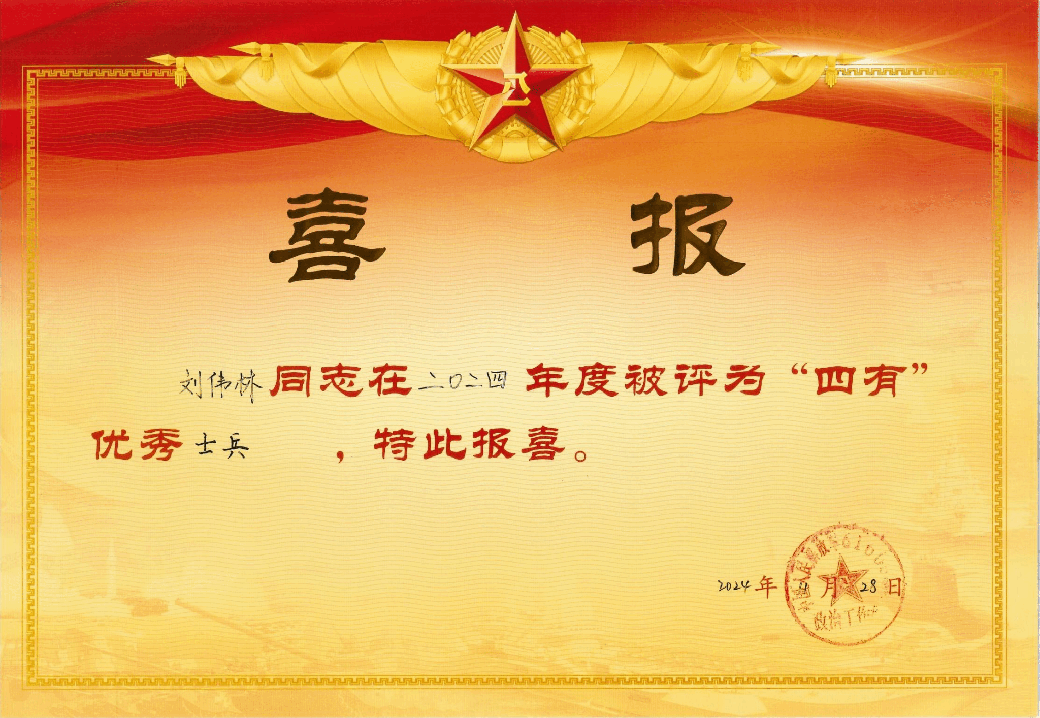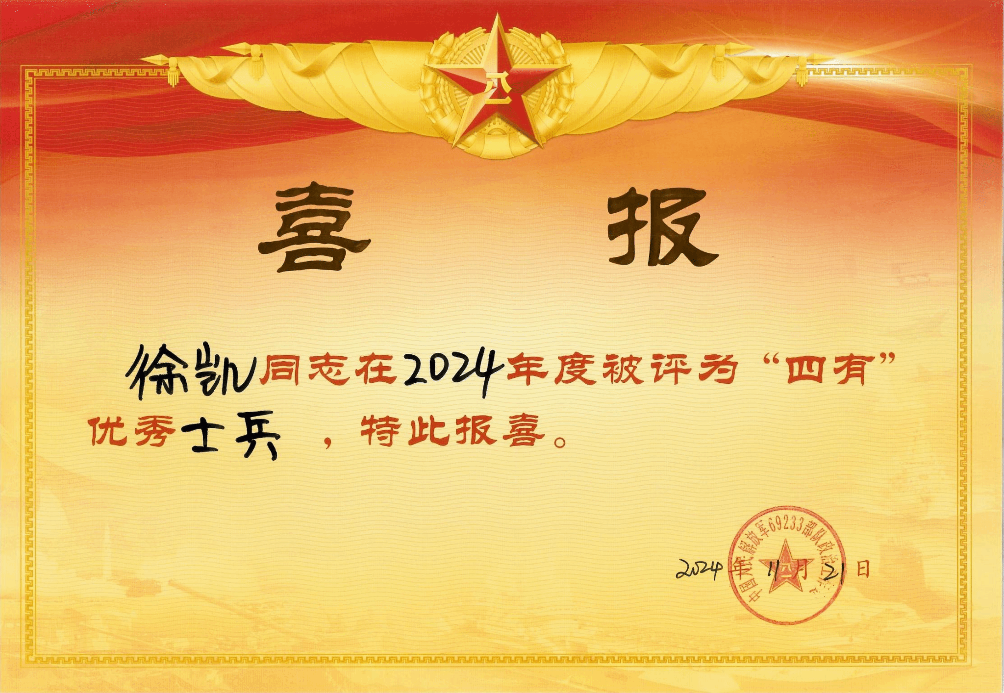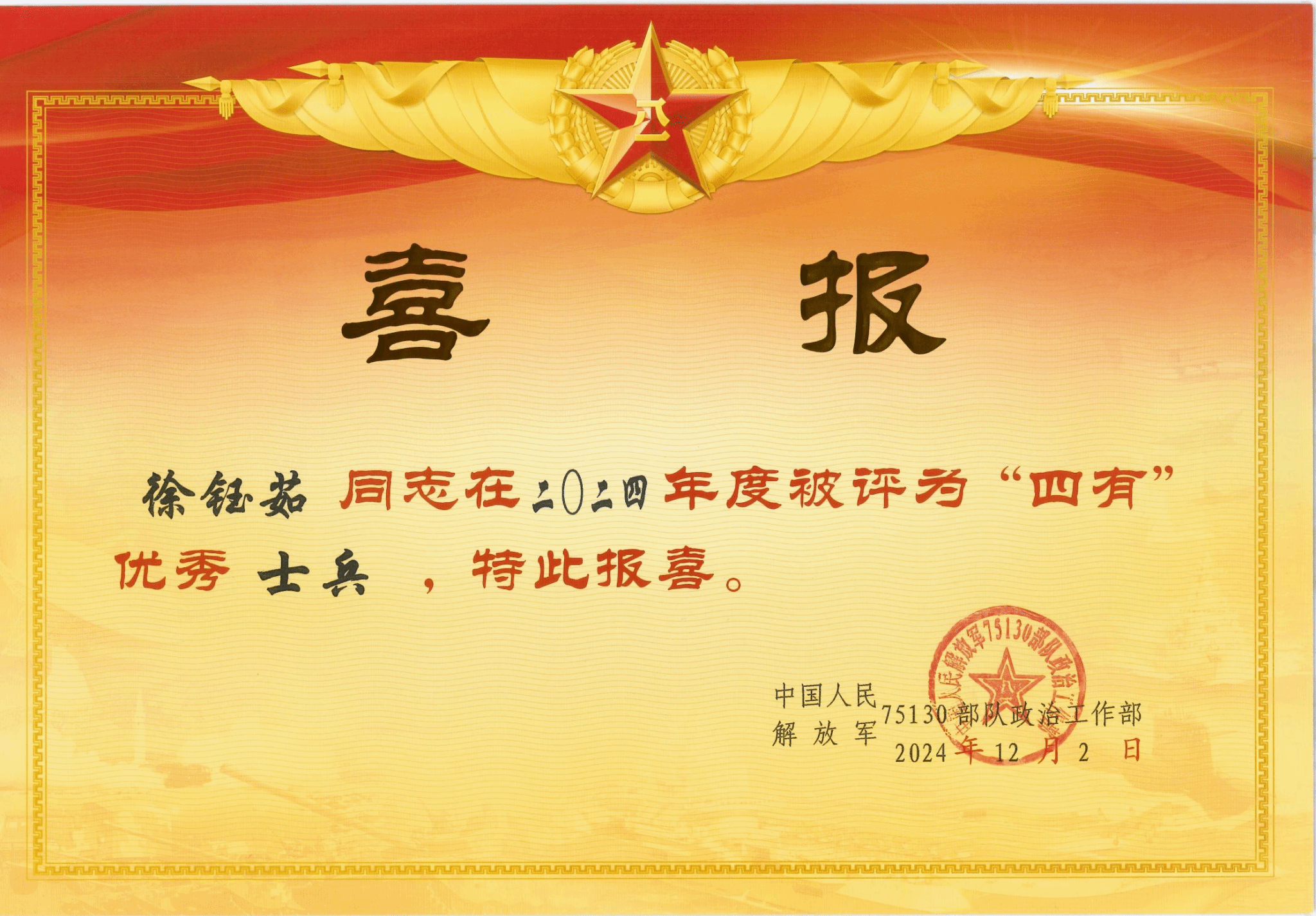 四有”优秀士兵是由部队评选,颁发由中央军委统一规范的奖状、证章、证书,并使用军队喜报专递信封寄发喜报的年度荣誉。“四有”优秀士兵的获得证明了该同学参军入伍后,将太阳官网“坚韧不拔、勇承重载,崇实求精、表里如一”的钢铁品质,应用到部队军事训练、政治学习与日常工作中,成长为“有灵魂、有本事、有血性、有品德”的优秀中国军人。四名同学的突出表现,充分展现了太阳官网人才培养的卓越成效和集成效应,必将激励着更多的学生投身国防建设,为实现强军目标贡献青春力量。