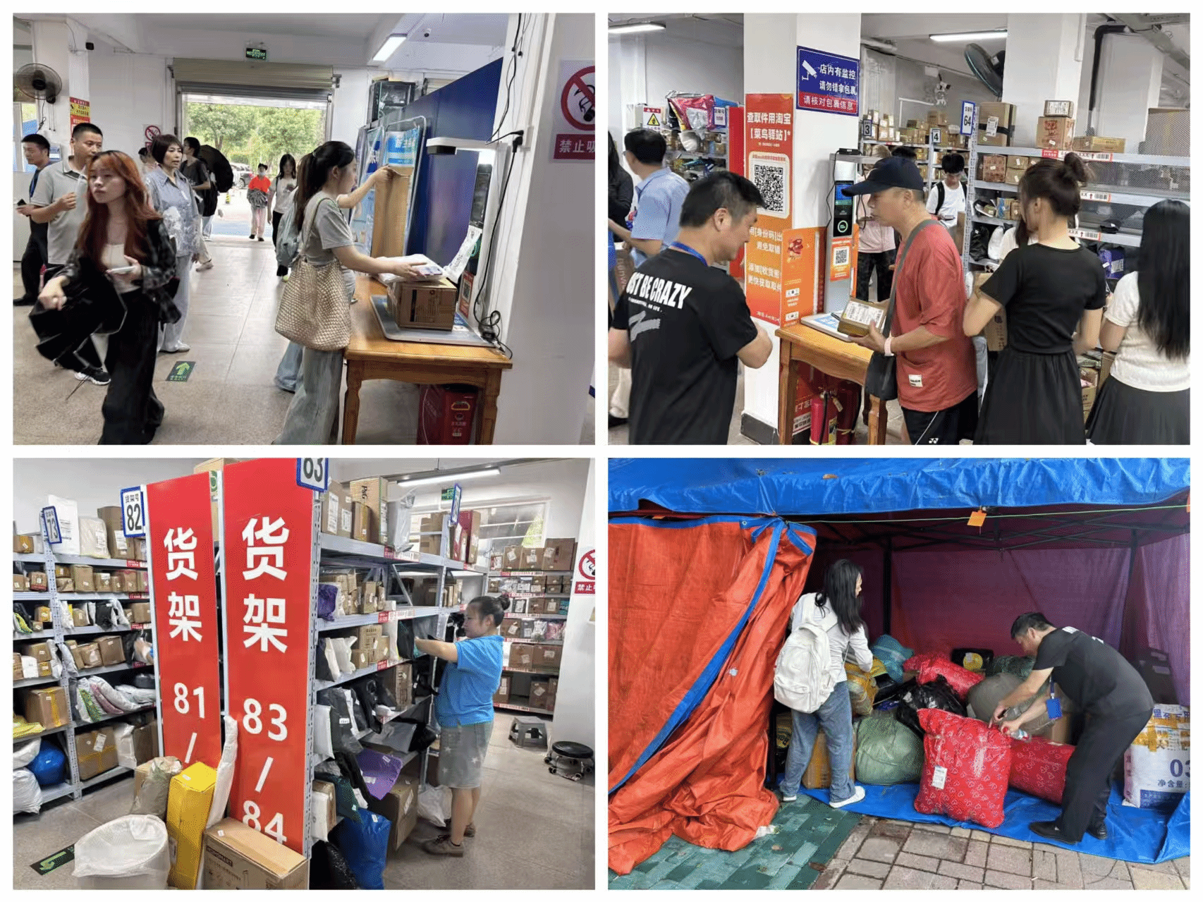 为应对仓储压力,临时搭建遮阳帐篷作为分流区,并借用邻近空置门面作为临时存放点,确保所有快递有序安置、妥善管理,用实际行动传递“高效后勤、用心服务”的理念,为报到新生顺利开启大学生活提供有力支持。