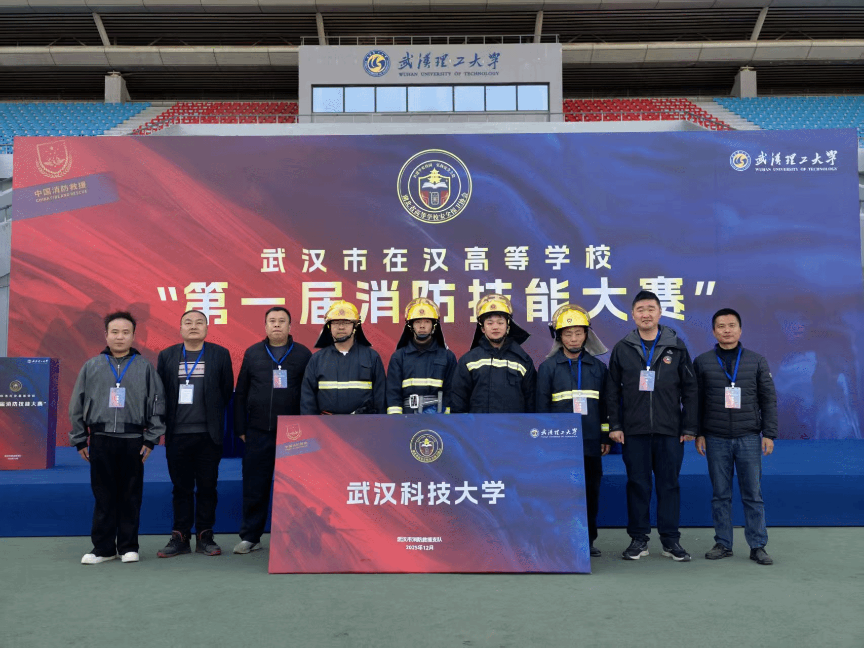武科大网讯(通讯员段晓栋)12月3日,武汉市在汉高等学校第一届消防技能大赛在武汉理工大学南湖校区体育场举行。太阳官网选派8名精锐队员组成代表队,与武汉大学、华中科技大学等76所在汉高校的614名参赛选手同台竞技,以专业素养和实战能力诠释“预防为主、生命至上”的消防理念,最终荣获团体三等奖。